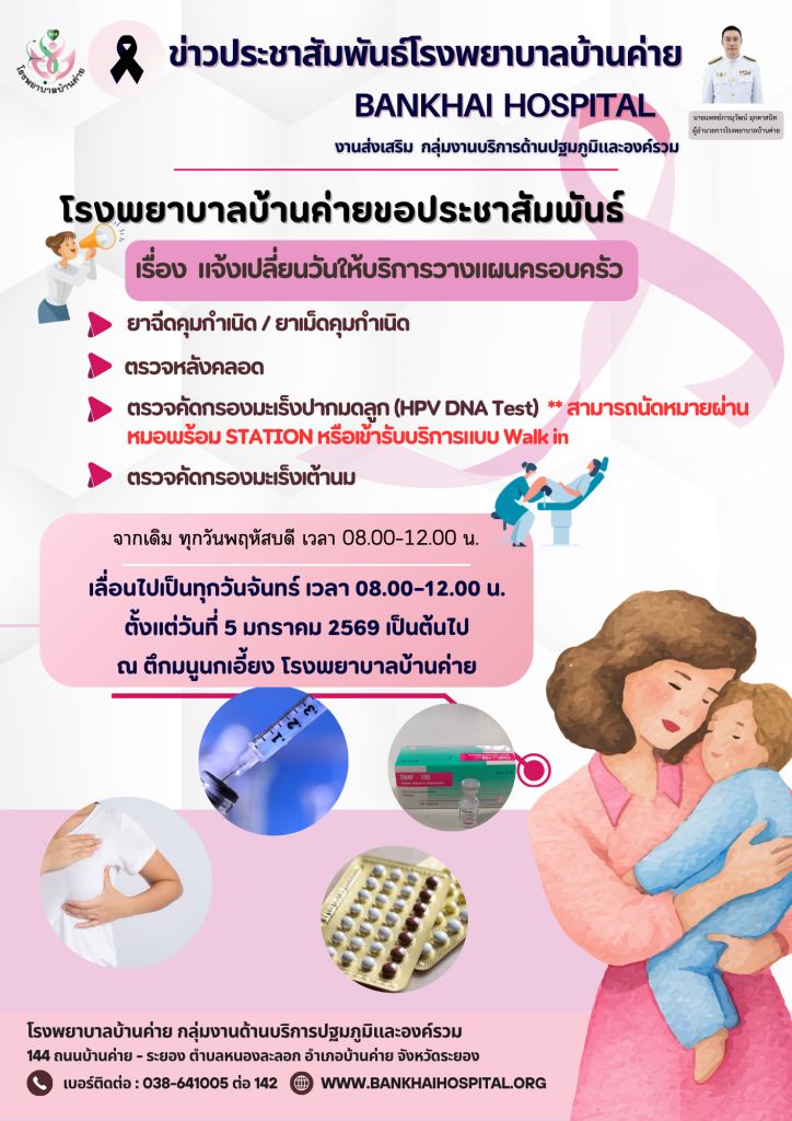 ประชาสัมพันธ์ผู้รับบริการแจ้งเปลี่ยนวันให้บริการวางแผนครอบครัว Posted on พฤศจิกายน 25, 2025พฤศจิกายน 25, 2025 by bankhaihospital 25 พ.ย. Continue reading →
