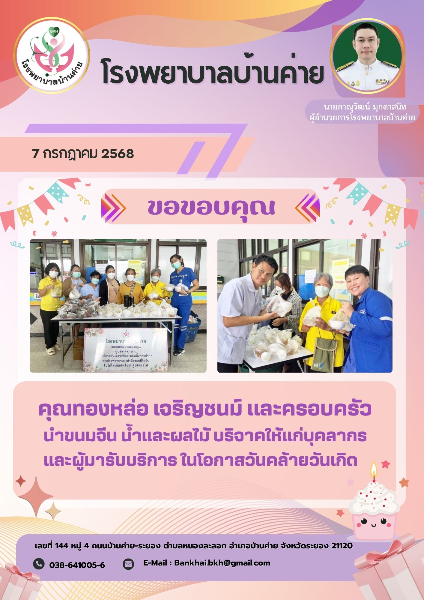 ประชาสัมพันธ์ผู้รับบริการโรงพยาบาลบ้านค่าย รับบริจาคในโอกาสวันคล้ายวันเกิดของผู้บริจาค วันที่ 7 กรกฎาคม 2568 Posted on กรกฎาคม 9, 2025 by bankhaihospital bankhaihospital กลุ่มงานทันตกรรม จัดกิจกรรมตรวจคัดกรองสุขภาพช่องปาก เครือบหลุมร่องฟันและฟลูออไรด์ให้กับกลุ่มวัยเรียน ในวันที่ 3-4 กรกฎาคม 2568 โรงพยาบาลบ้านค่าย กลุ่มงานทันตกรรมจัดกิจกรรมเยี่ยมบ้านแบบบูรณาการ
